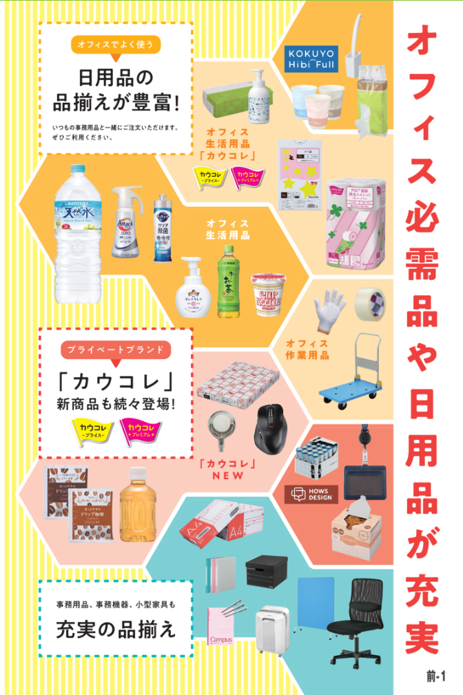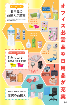 OAサプライ用品、事務用品、文房具をはじめ、トイレットペーパーや洗剤など生活用品、お茶・水など飲料まで、オフィスの必需品を幅広く掲載しています。